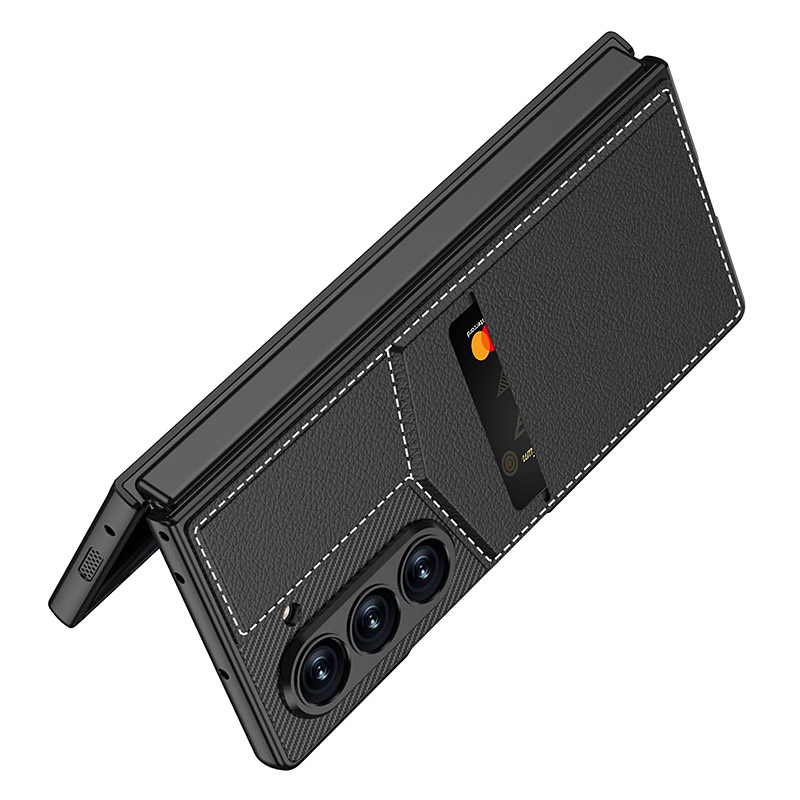 Луксозен кожен калъф за Samsung Galaxy Z Fold 7 с интегриран джоб за карти и сгъваем капак, който служи като стойка. Твърд гръб с карбонова текстура и PU кожа с декоративен шев. Повдигнат кант около камерата и прецизни изрези.