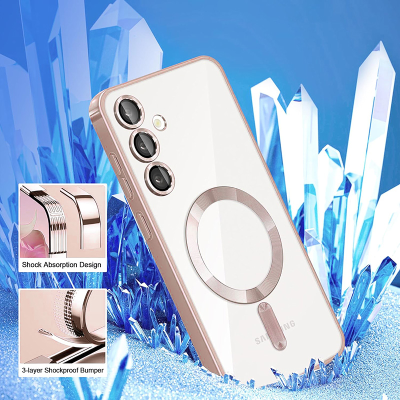 Луксозен калъф с Magsafe за Samsung Galaxy S25 Plus с рамка с метален отблясък. Прозрачен и твърд калъф с бързо безжично зареждане на телефона. Отличава се с красивия външен вид, метални копчета и дизайн с рамка наподобяваща метал. Има пълна защита на камерата, а рамката около обективите внася допълнително лукс към този кейс.
