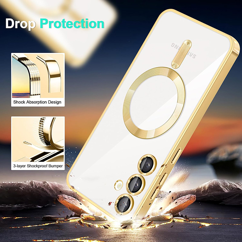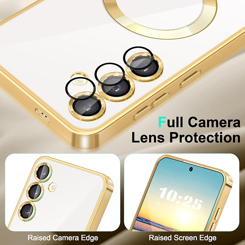 Луксозен калъф с Magsafe за Samsung Galaxy S25 Ultra с рамка с метален отблясък. Прозрачен и твърд калъф с бързо безжично зареждане на телефона. Отличава се с красивия външен вид, метални копчета и дизайн с рамка наподобяваща метал. Има пълна защита на камерата, а рамката около обективите внася допълнително лукс към този кейс.
