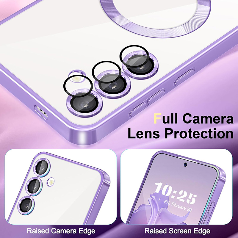 Луксозен калъф с Magsafe за Samsung Galaxy S25 Ultra с рамка с метален отблясък. Прозрачен и твърд калъф с бързо безжично зареждане на телефона. Отличава се с красивия външен вид, метални копчета и дизайн с рамка наподобяваща метал. Има пълна защита на камерата, а рамката около обективите внася допълнително лукс към този кейс.