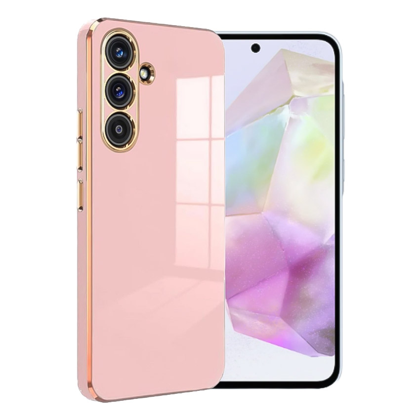 Лъскав калъф за Samsung Galaxy A56 със златен кант и бутони. Красив калъф с метални бутони и огледално лъскав гръб. Предпазва камерата на телефона благодарение на високия ръб.