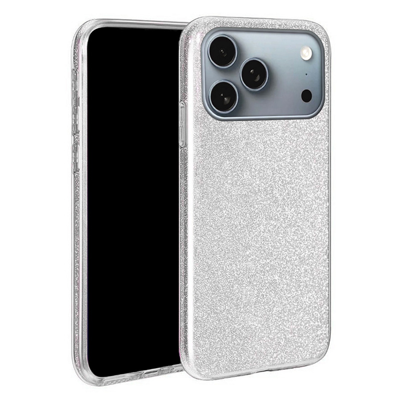 Калъфът е с искряща повърхност (кристален/брокатен ефект), която улавя светлината и прави телефона по-отличим. Метализираната рамка около камерите допълва визията и подчертава контурите на телефона.