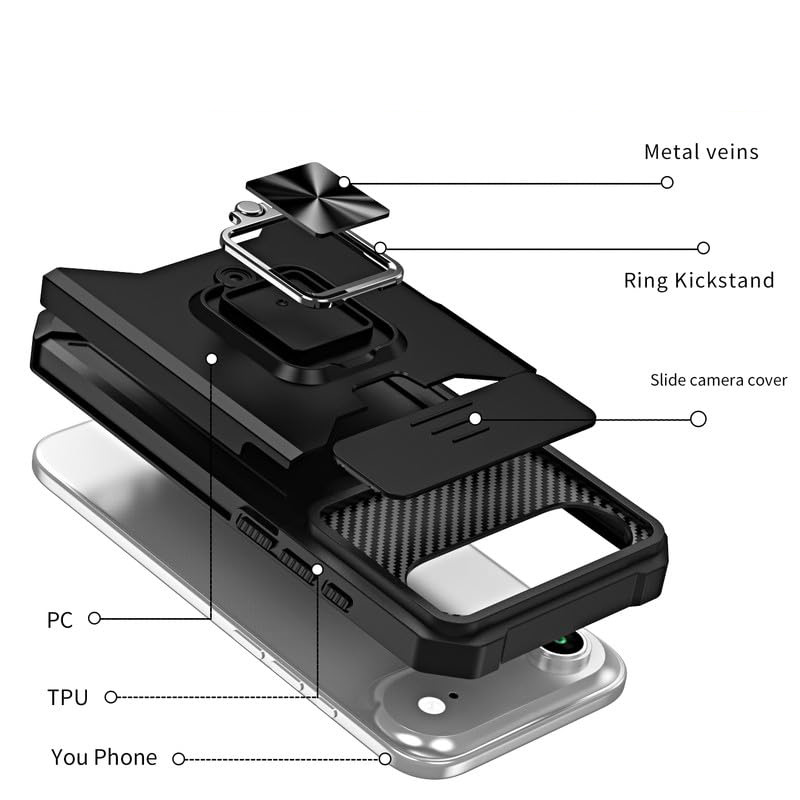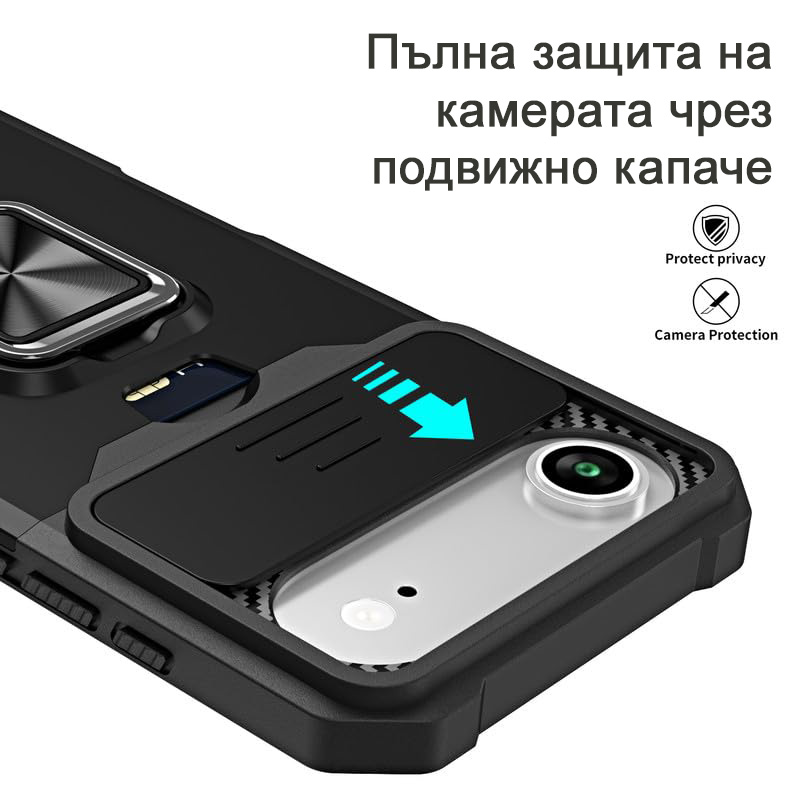 Удароустойчив калъф с държач за карти за iPhone 17 Air и поставка за маса. Калъф с уникален дизайн с място за кредитни карти и пари, който изпълнява ролята на портфейл. На гърба има магнит за закрепване към магнитни стойки за кола. Този калъф позволява и безжично зареждане, ако свалите външния слой.  Има двойна сигурна защита на корпуса и камерата, благодарение на подвижното капаче. Пръстена се използва за поставка на маса, за да гледате удобно филми.