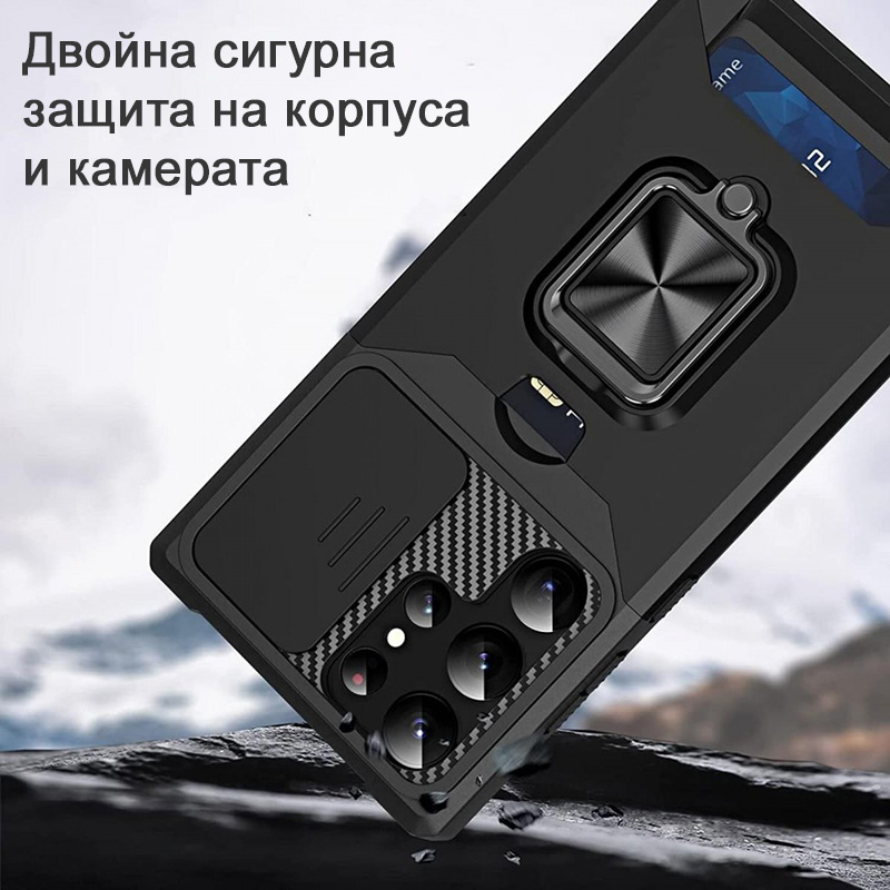 Удароустойчив калъф с държач за карти за Samsung Galaxy S24 Ultra и поставка за маса. Калъф с уникален дизайн с място за кредитни карти и пари, който изпълнява ролята на портфейл. На гърба има магнит за закрепване към магнитни стойки за кола. Този калъф позволява и безжично зареждане, ако свалите външния слой.  Има двойна сигурна защита на корпуса и камерата, благодарение на подвижното капаче. Пръстена се използва за поставка на маса, за да гледате удобно филми.