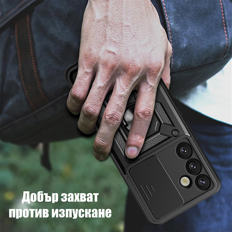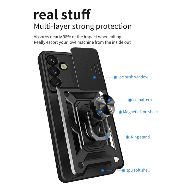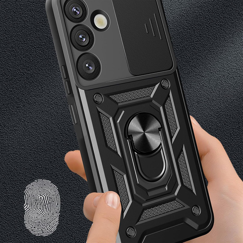 Удароустойчив калъф с пръстен за Samsung Galaxy S26 Plus, който ще предпази сигурно телефона ви. Изработен от здрав и твърд материал с голяма дебела, калъфа абсорбира ударите и предпазва телефона и екрана от повреди. На гърба на калъфа има пръстен, който може да използвате като поставка или при разговори с телефона. Повърхността е абразивна и осигурява добро захващате с ръката, което предотвратява изпускане. За защита на камерата се грижи подвижното капаче, което покрива изцяло камерите.